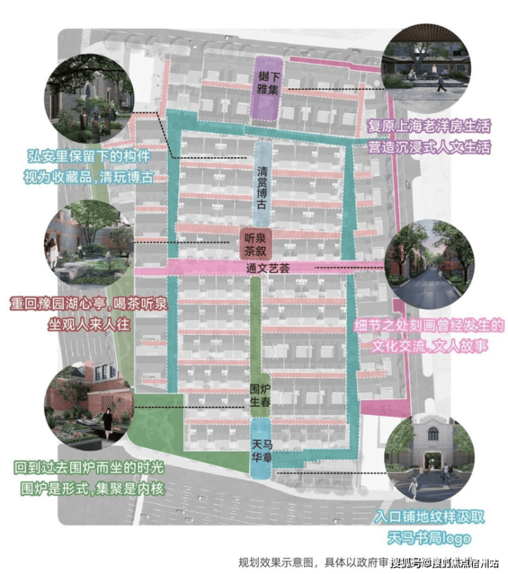 在社区的中轴上,从入口处「天马华章」迈步前行,「围炉生春」「通文艺荟」「听泉茶叙」「清赏博古」贯穿到「樾下雅集」,海派生活画卷昨日重现。