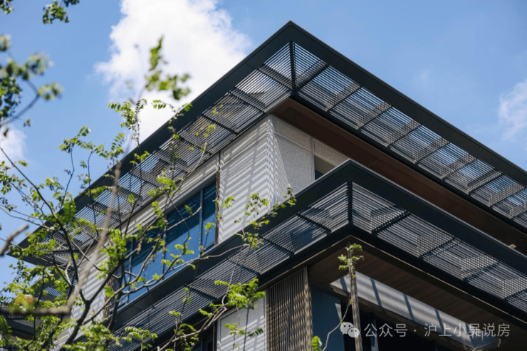 建筑上,宋式三段式立面,深檐挑角,东西双向宋风窗扇、檐下三重宋韵装饰构件、歇山顶(联排)等宋韵呈现,再现宋式建筑风骨;立面横向采用大面玻璃幕墙,实现极致3:7窗墙比的同时又呈现出现代东方审美。最值得一提的是项目立面采用古铜色铝板+木纹铝板+古铜色格栅+仿石铝板+陶土瓦,让建筑本身温润厚重从而历久弥新。