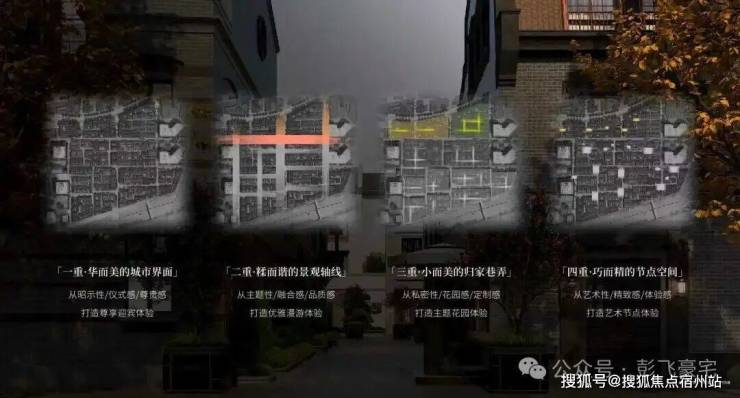 四重景观空间 层层递进的隐居哲学从城市界面到节点空间,由大到小打造“四重空间感受”,营造中西和鸣的感官体验。从华而美的城市道路、糅而谐的景观轴线,美而精的归家巷弄、雅而巧的节点空间,每一处场景皆实现私密与艺术的交融,感受城市繁华与归家宁静的交叠。