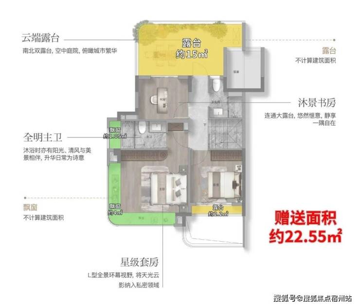 全屋飘窗全赠送约9.8㎡,配合约7.2㎡的大阳台(计一半建筑面积)不仅增加了实际使用面积,更在视觉上提升了空间的通透感。