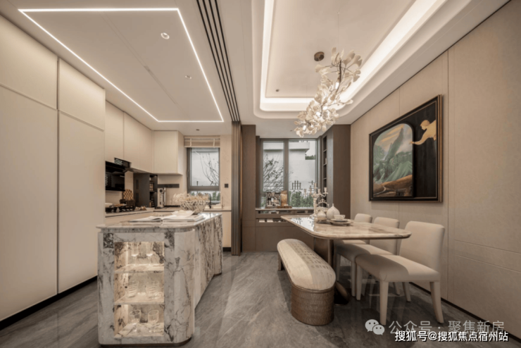 【海上·清和玺】空间采用奢材定制,将品质延续到每个细节中。门庭延街的外立面,以精工定制弧形贝金米黄大理石为主调,镶嵌典藏级老虎玉大理石,点缀古铜色现代海派艺术感灯器。整体呈现一种流转于百年海派的贵雅气质。