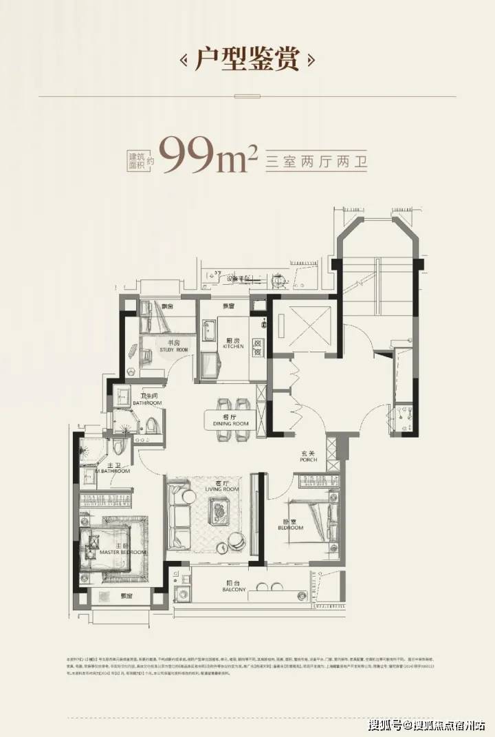 建面约99平米3-2-2飞机三开间朝南户型,动静分区,南北通透,南向面宽 约9.5m, 采光和通风条件十分优越!