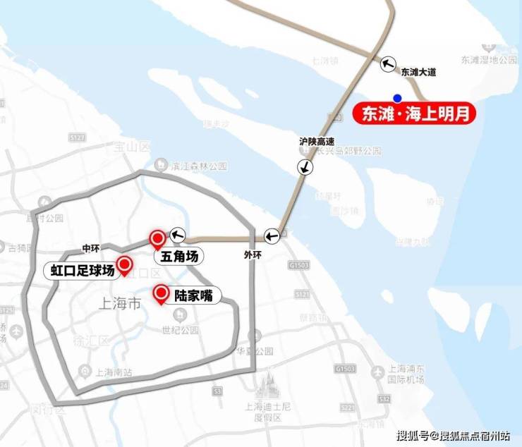 项目区位示意图 自驾方面,从项目出发到浦东金桥、杨浦五角场,通过长江隧道-绕城高速-五洲大道非常方便。