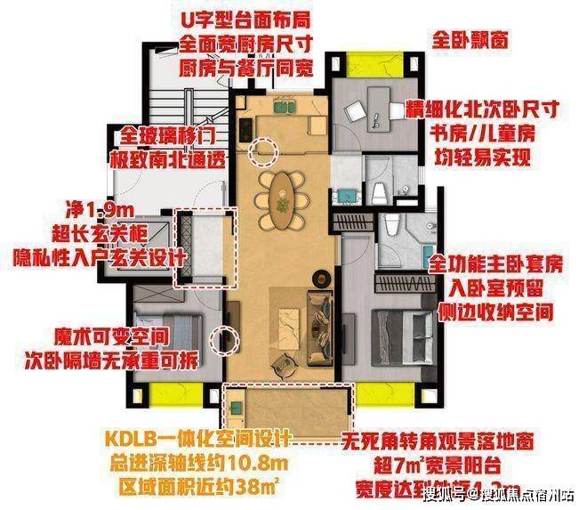入户玄关及超大玄关柜设计,三开间朝南飞机户型KDLB一体化设计客厅次卧魔术可变空间U型厨房大尺度宽景阳台+转角观景落地窗舒适北卧三段式干湿分离客卫全卧室飘窗,等等