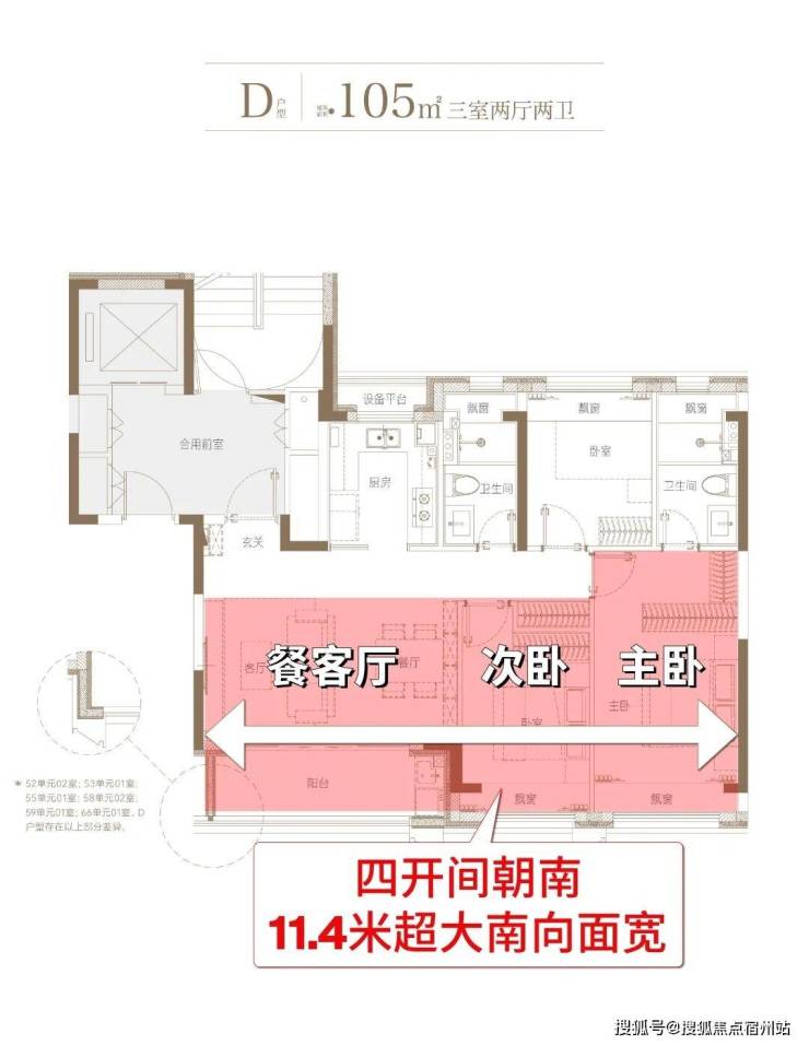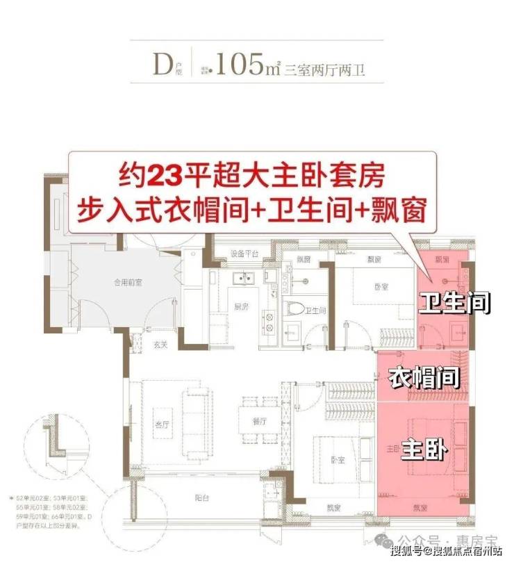9#南向有中轴景观和别墅区,向西与6#略错开,也有不错的瞰景视野,主力建面约105㎡户型,总价相对较低,性价比更高!我们重点来看主力的建面约105㎡3房2卫户型:
