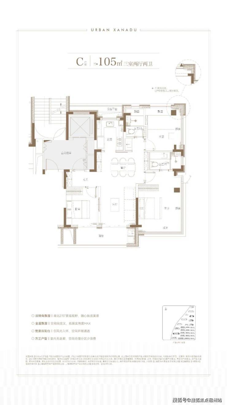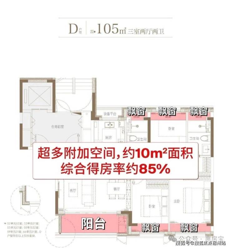 整体约10㎡附赠面积,综合得房率约85%。另外,项目还有建面约105㎡3房2卫明星户型,设计更为亮眼。