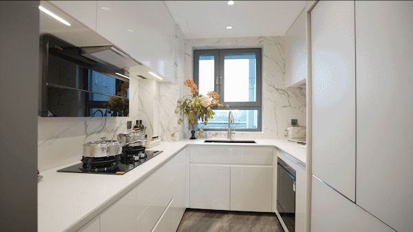 项目在餐厨空间的细节上把控也非常到位,U字型设计利用率更高并且预留了冰箱点位。