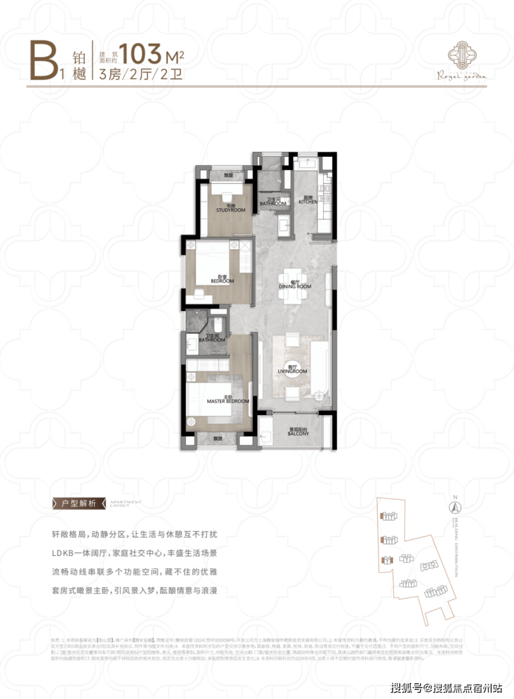 适合三口之家或年轻家庭居住的 动静分区户型 , 厨房、餐厅、客厅及阳台一体化设计 ,动静完全分区设计,相当人性化! 主卧套房设计满满尊崇感 ; 次卫三分离干湿分区设计 ,考量十分贴心!