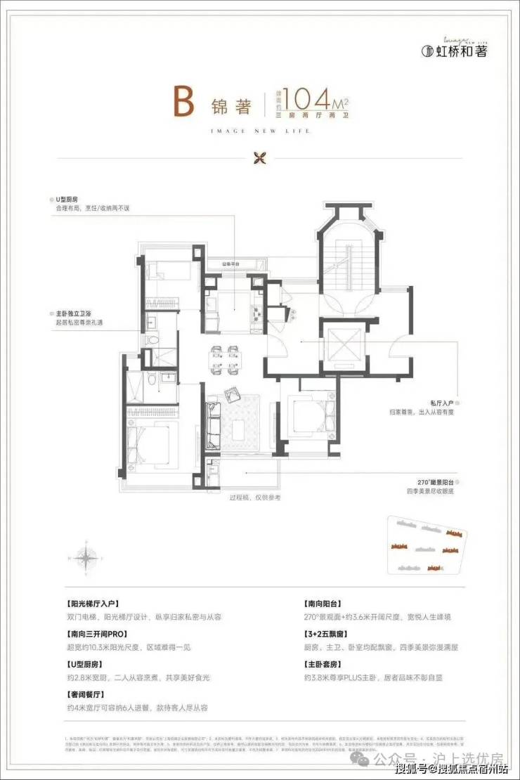 建面约104㎡3房,在建面94㎡小3房优点上,又进一步升级了尺度感, 约10.3m的南向面宽,为室内带来了出众的采光面和尺度感,这个户型无论从实用性、尺度感,亦或是视野、采光、私密性来说,都做得相当优秀。