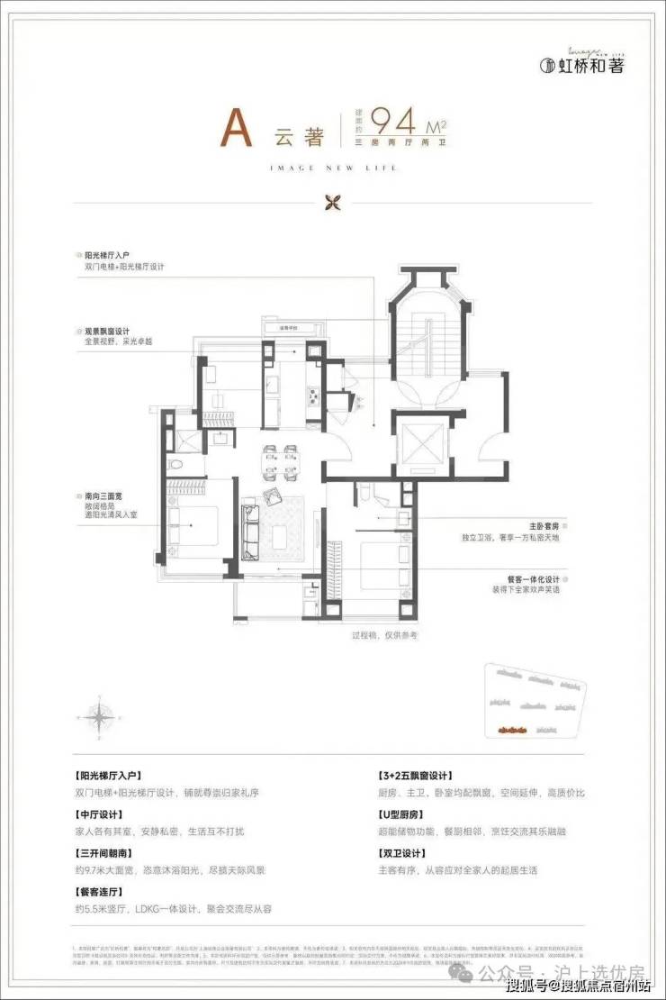 “麻雀虽小五脏俱全”虽然相比一般百平米左右三房,该户型在建筑面积上缩减了约10㎡,但功能与尺度却不逊色, 南北通透的飞机户型,没有过道浪费,因而保证了适宜的尺度感, LDKG一体化设计让几个功能区独立又互通,没有视觉遮挡也使得将空间感进一步拓展, 阳台270°采光+多飘窗设计,打开更多的采光面与视野面,也大大提升了室内的通透感与舒适度,细节方面, 次卫干湿分离的设计,提高了使用效率这对于小户型非常重要。