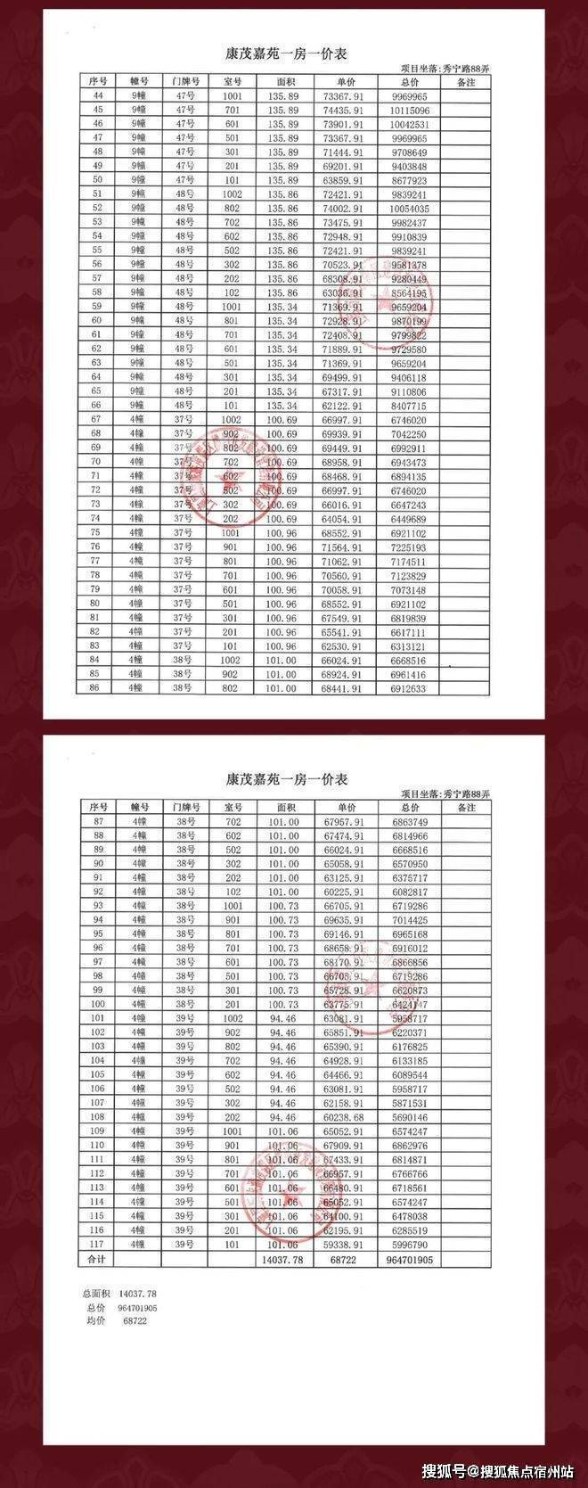 一房一价表: