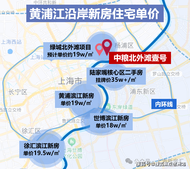 在上海一线滨江板块地图中,陆家嘴,黄浦滨江、徐汇滨江等地新房单价都已突破 19万/㎡ 。今年6批次,北外滩地块也紧随其上,溢价率46.3%,预计售价约 19万/㎡ 左右,成为今年最炙手可热的滨江板块之一。