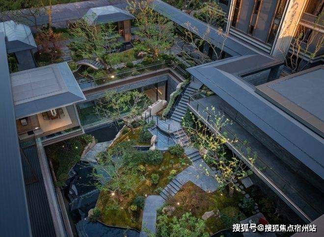 再往里走就是近460㎡的下沉式庭院,精选太行山金景石堆叠成小山丘,引进溪水汇聚成池塘,并移栽岭南珍贵的古桩铁冬青和中华原生乌桕树,形成一幅立体山水画卷。