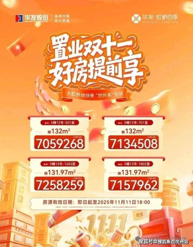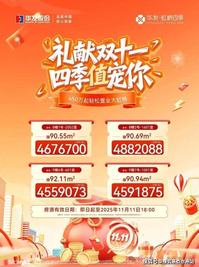 最新消息: 17号线嘉松中路地铁盘【华发虹桥四季】四期加推98套建面约98-100㎡3房;11月8日已过会均价56651元/㎡;往期少量建面约91-132㎡3-4房;悦惠双十一,总价450万起!售楼处线上火热预约中!