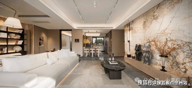 比如墙面使用大量温润木饰面铺陈,电视背景墙选用岩板,客厅地面铺设云朵拉灰石材、餐边柜台面镶嵌卡里冰玉大理石,将高级感渗透到生活的每个角落。