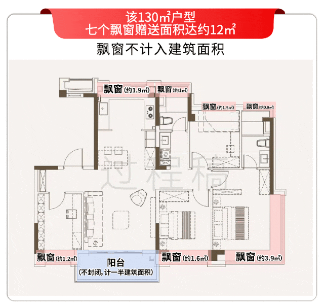 其次,全屋七飘窗,赠送面积达约12平,比常规次卧都大。