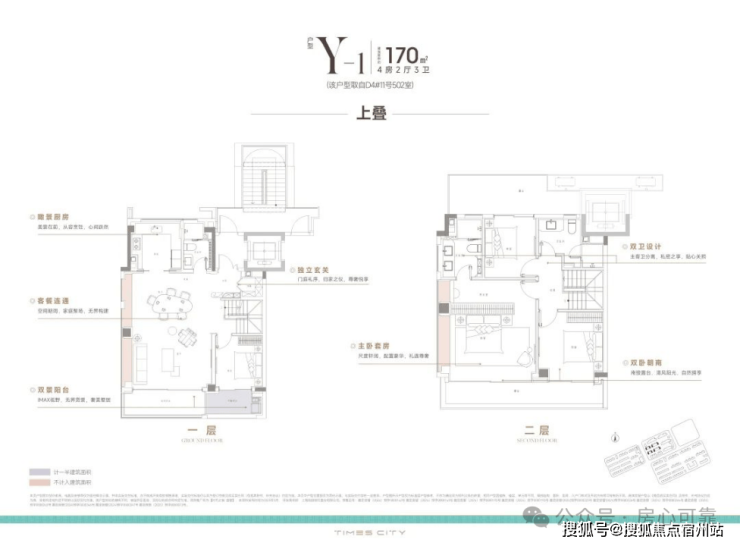 上叠产品创新采用 南北双露台+南向双阳台布局, 270度全景采光面让室内外空间完美融合。边套户型的1楼客餐厅和2楼主卧,更增设侧飘窗,将社区美景尽收眼底。