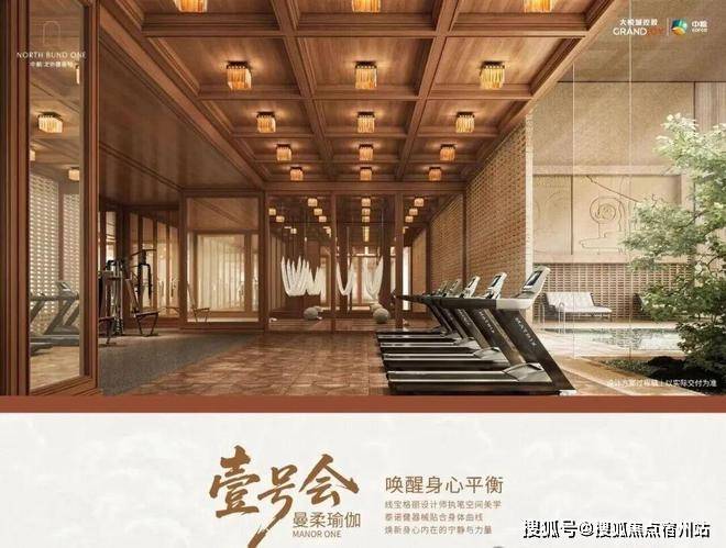 瑜伽健身区,大幅落地窗引入自然光线,✅✅中粮北外滩壹号售楼处电话:400 - 8824 - 258✅✅天花的格栅造型,地面的复古拼花木地板,都透出浓厚的海派风情。