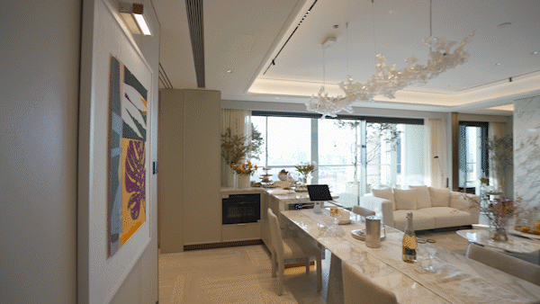 设计背书由问鼎国际大奖的著名设计师吴滨操刀,延续其“汤臣一品5亿顶复”的“摩登东方”理念。以黄浦江为灵感,营造“阅尽千帆后的宁静与松弛感”。通过8.5米南向宽厅、270°环幕玻璃 、无冗余装饰的减法美学,让空间如江面般舒展,视野极度开阔。