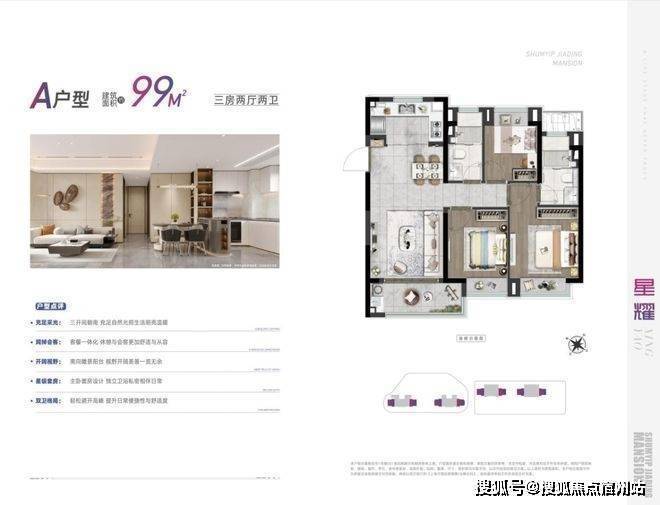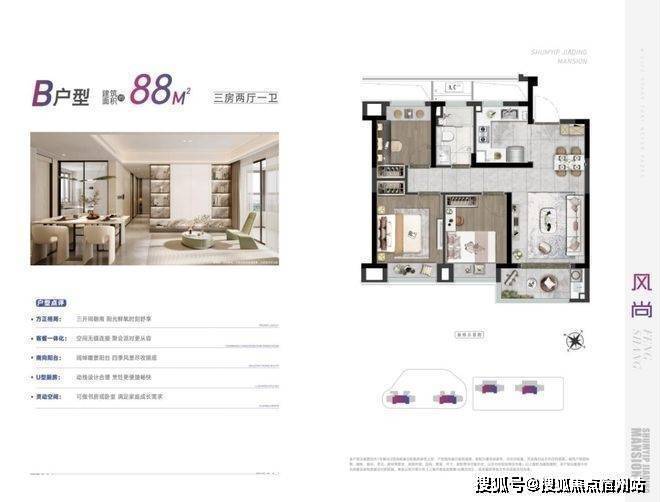 深嘉上府以88-99㎡的明星爆款小户型,圆年轻人的置业梦想。其中,88㎡户型以三房两厅一卫的格局,兼具功能性与尺度感。南向三开间,做到两间卧室朝南,这样的面宽,媲美市面上100㎡户型的新房尺度。u字形的厨房,动线合理。餐厅空间,能够从容摆放一张四人大餐桌。全屋飘窗设计,将赠送空间拉满。