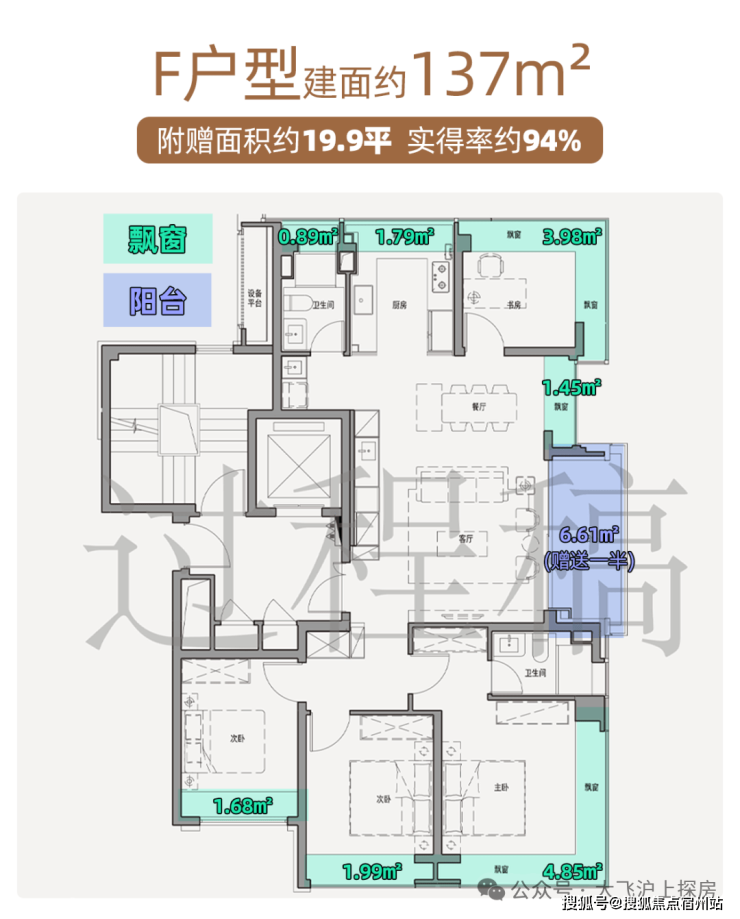 全屋7飘窗+半封阳台,赠送面积近20㎡,实得率约94%。