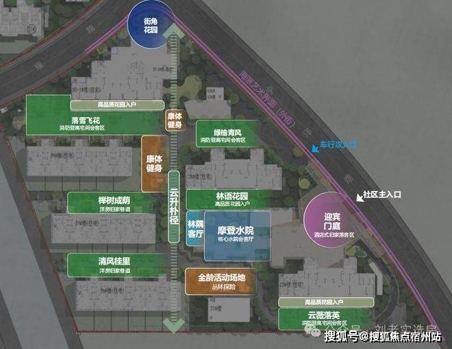 五维,是景观的层次:从社区主入口的酒店式落客区开始,到摩登水院、核心水院会客厅、林隅客厅、全龄活动场地、街角花园……它不是一条直路,而是一层一层递进的景观序列。