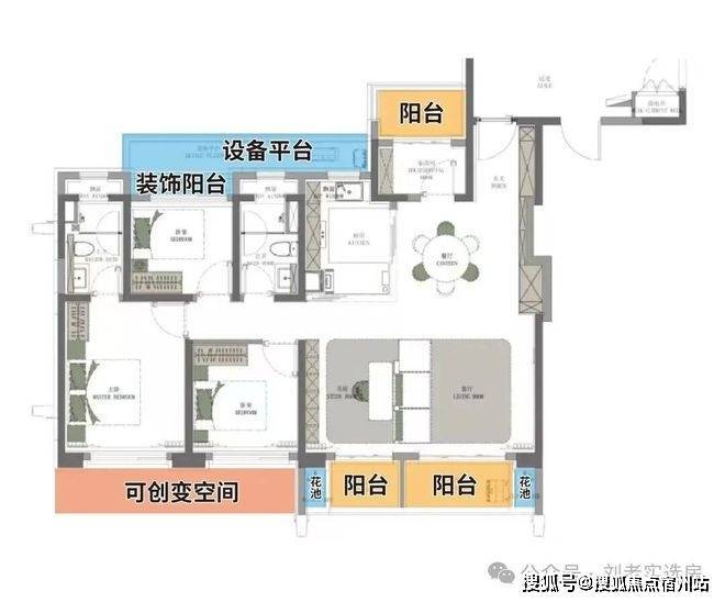 建面约122㎡3房,这个面积做3房,同时还附加了3阳台+飘窗+可创变空间等优势。