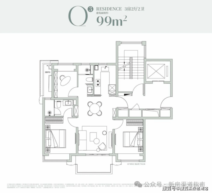 厨房、餐客厅、阳台形成直线通风廊道,南向三开间+宽尺客餐厅,轻松容纳二胎三代家庭的日常;