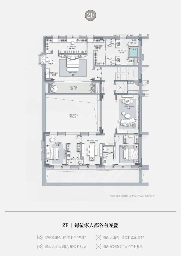 • 一层长辈套房设计,南向独立小庭院,莳花弄草,晨练太极自在四季