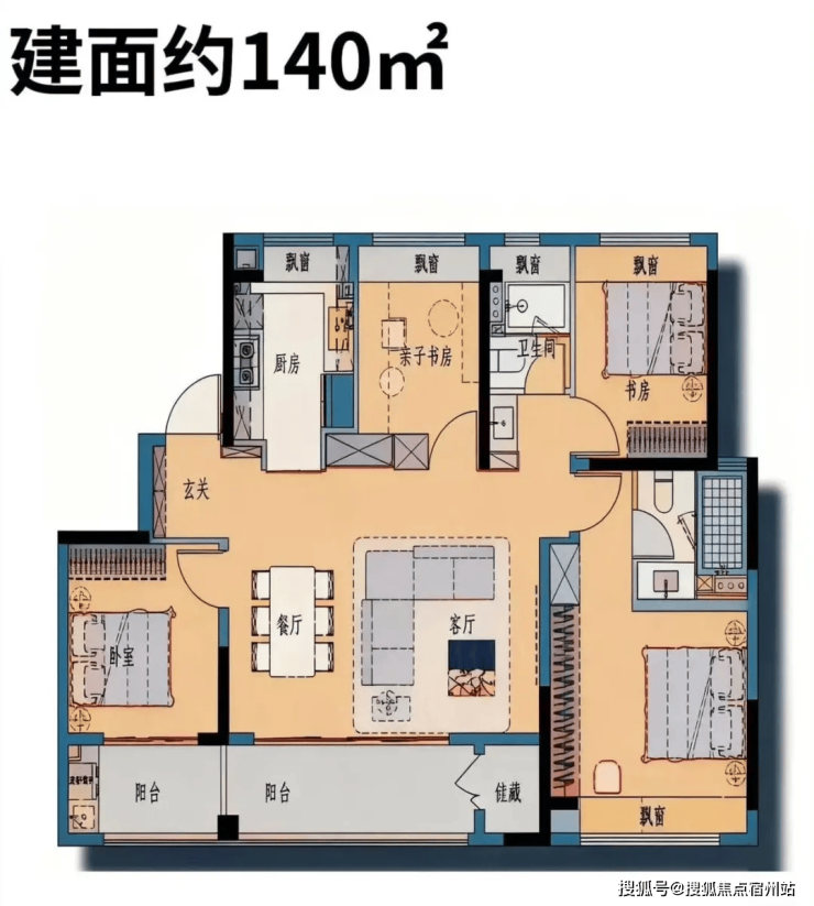 最令市场震撼的,是其在户型设计上的“降维打击”。以建面约143㎡的四房为例,其使用率(得房率)达到了惊人的约93%-1。这得益于全屋多飘窗赠送的设计以及剪力墙的优化布局。户型采用横厅搭配南向双阳台设计,不仅引用了淀浦河的滨水景观,更在功能上实现了“四叶草”般的静居布局,三代同堂亦能互不干扰。而建面约120㎡的三房,同样实现了三开间朝南与约86%的高使用率,尺度感远超同面积段产品-1-3。