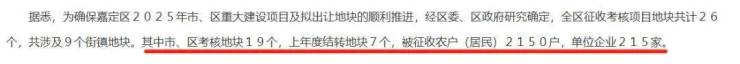 以嘉定为例,2025年嘉定区征收考核项目地块共计26个,共涉及9个街镇地块。其中,被征收农户(居民)2150户,单位企业215家。