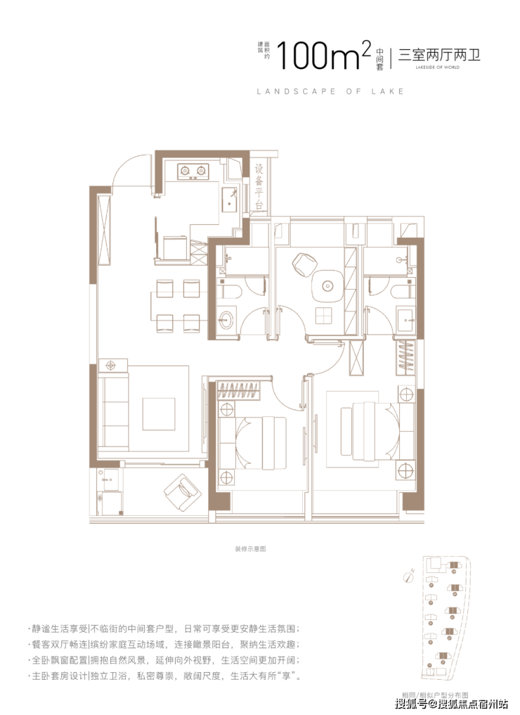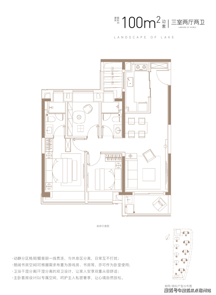 建面约100㎡3房2厅2卫,功能性和尺度感完美结合的3房户型。