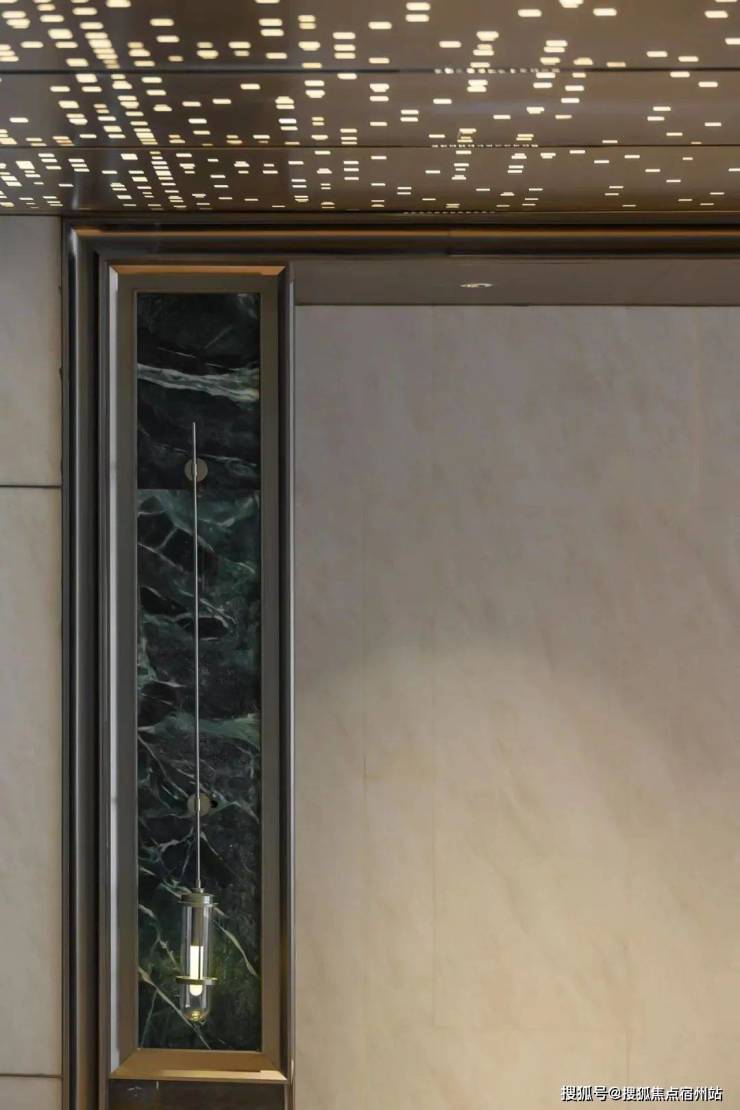 架空层入户门厅处,以普拉达绿奢石为背景装饰,提升了整体空间的质感,结合金属铝板装饰搭配,归家仪式感满满。