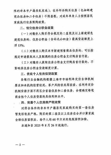 为更好满足居民刚性住房需求和多样化改善性住房需求,促进房地产市场平稳健康发展,8月25日,市住房城乡建设管理委、市房屋管理局、市财政局、市税务局、人民银行上海市分行、市公积金管理中心等六部门联合印发《关于优化调整本市房地产政策措施的通知》(以下简称《通知》),包括调减住房限购、优化住房公积金、优化个人住房信贷以及完善个人住房房产税等政策。