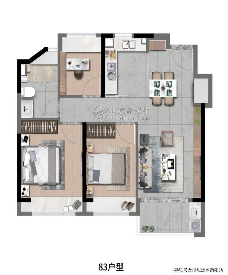 象屿深入考量空间与场景的运用,将生活中看得见与看不见的细节进行了细致打磨。玄关、阳台、厨房、卫浴均设置科学收纳空间,营造高品质生活体验的同时,更带给居者层建面约83㎡3房2厅1卫