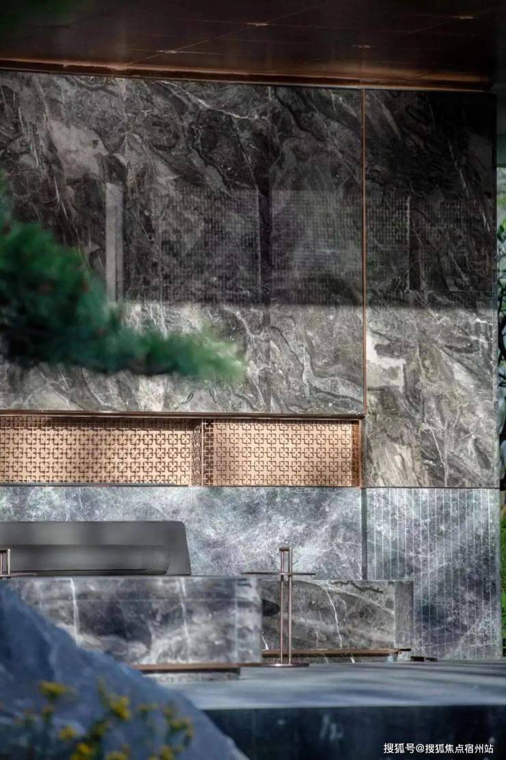 耳其矿区的进口石材,彰显着项目和业主的格调。右侧是一座高约5.6m,宽约7.6m的星辉屏风。