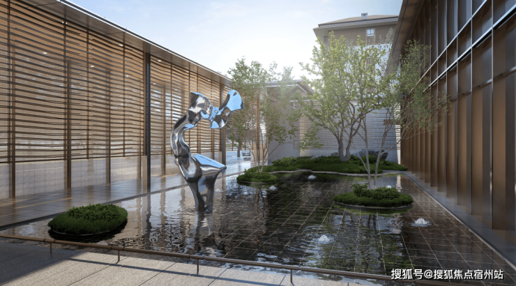 水作为贯穿兴云间整座园区最重要的元素之一,主入口处的水景雕塑《晓风艺墅》具有至关重要的地位,金属的光泽与水光的灵动交相辉映,成为空间中的点睛之笔。