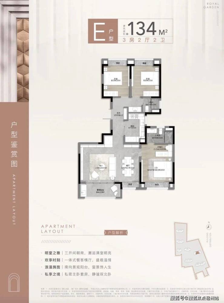 104㎡3户型特点:该户型多为楼栋的 东边套,是一个观景户型。客厅连接270°阳台,视野出众。双卧朝南,阳光满溢。从次卫布局看,如果家庭人口较少,该户型还能做成双套卧。