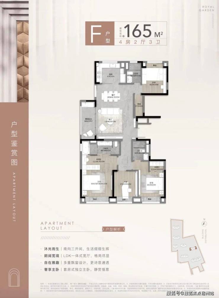 第四个亮点, 是主卧套房设计,自带独立卫生间和大飘窗,增强私密性。