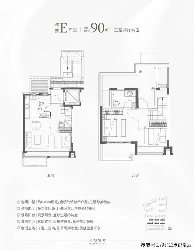 华发还有目前松江比较稀缺的叠加房源,分为六层叠加和四层叠加。主力户型建面约90-133㎡,特别是这个E户型,建面仅约90㎡,对于想住叠加但预算有限的购房者来说,面宽约6.45米,上下动静分离带,是个不错的选择!