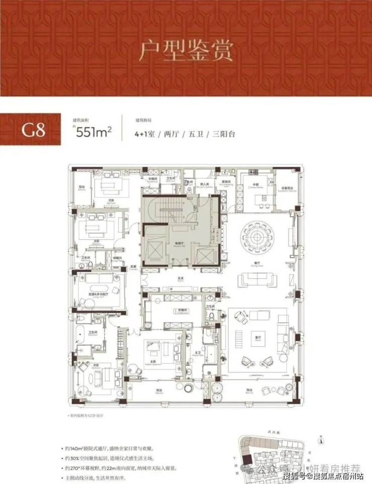 以约160㎡单层空间承载家庭生活的仪式感,约60㎡客餐厅贯通休闲阳台,空间通透、气度非凡。全套房设计,保证每位居者的私密与舒适,礼序有致、功能齐备。