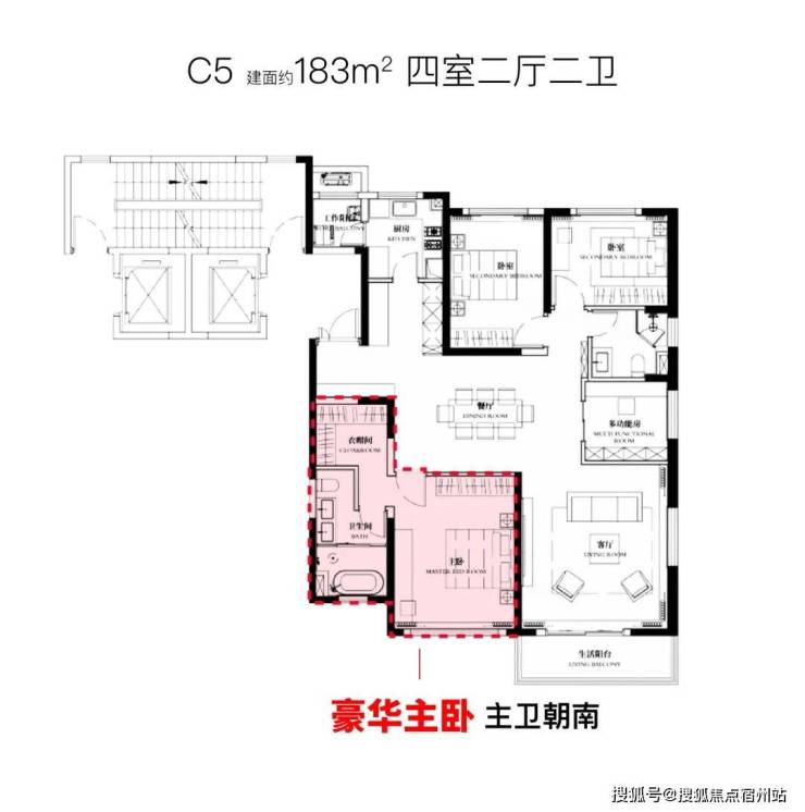该户型 主卧整体足足有约5.9米的南向开间,比客厅还要开阔。这在整个豪宅领域都是极为少见的!