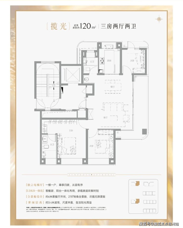 建面约120㎡的阔境平层三房,主打3.5面宽、方厅格局与多阳台拓展,户型方正无浪费,动静分区明确。客厅连接宽景阳台,最大化引入自然采光与社区景观,清晨的第一缕阳光能轻松洒满房间,傍晚则可以在阳台上欣赏落日余晖,为高端刚需改善的三口之家或年轻高净值自住家庭营造出温馨舒适的生活氛围。