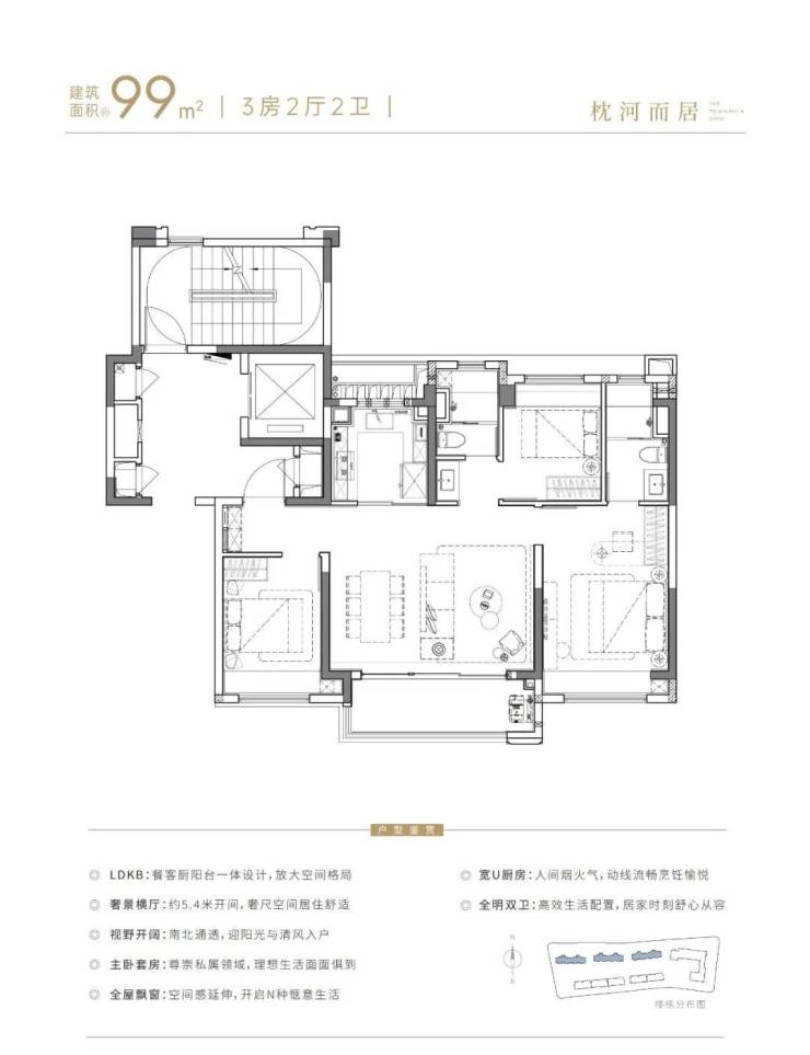 建面约99㎡滨水高层户型方正,功能性与尺度感兼得,在保证采光的同时,呈现开阔的空间场景。