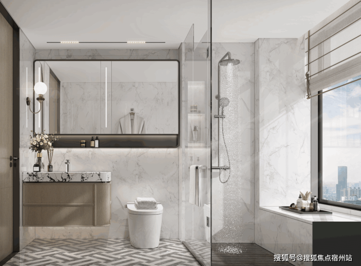 卫生间的收纳更是创新!双卫配置大容量镜柜并增设置物台提升实用性;公卫通体收纳柜,细枝末节的杂物均可一并容纳!