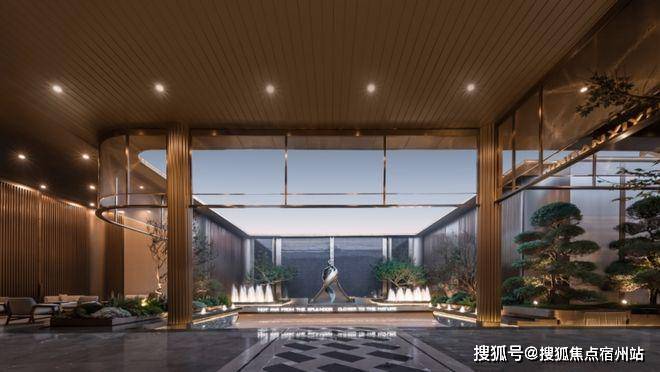 入口处酒店港湾式落客空间,艺术感造型树,蓝翡翠奢石达到第一眼的惊艳;内部精致典藏的水院空间,以雕塑、喷泉水幕、造型树经典组合,打造景观点,更大地扩充与景观的接触面,度假的松弛感油然而生。