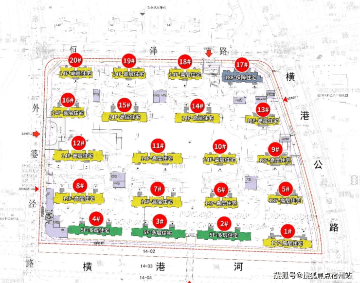 14-01地块:占地面积约6.09万方,总建筑面积约18.24万方,容积率2.0,由16栋14-18F高层住宅、3栋5F多层住宅、1栋18F保障房以及若干配套用房组成;