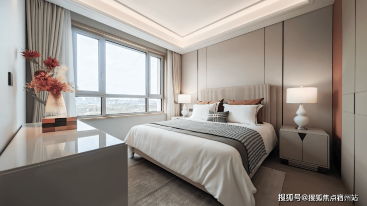 另外,一般项目为了凸显尺度感不会放床头柜,而在该户型,宝华不仅放了正常尺寸的大床,还配了两个大床头柜,主卧空间一目了然。