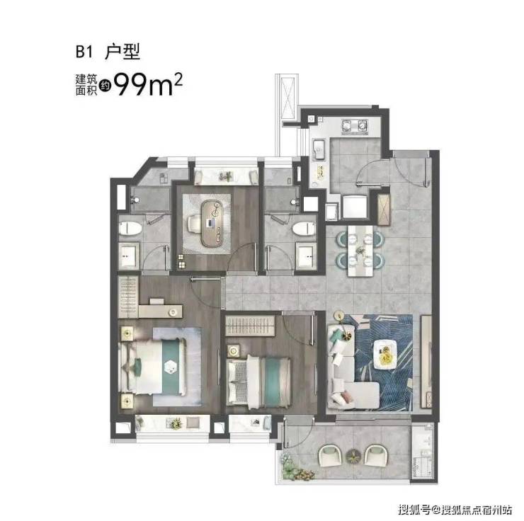 建面约99㎡3房户型图▼
