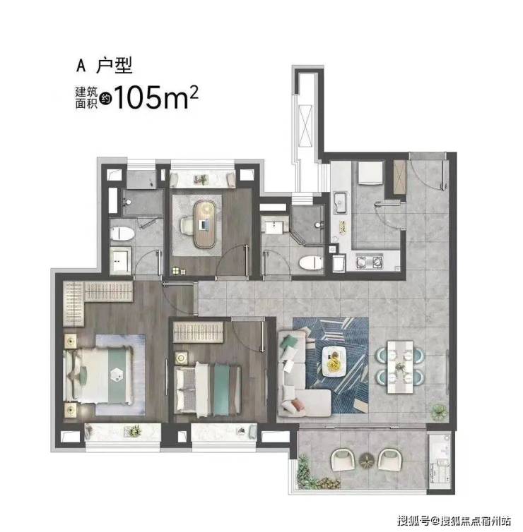 建面约105㎡为5.1米宽厅设计外接大阳台,这对黄金组合一方面撑开户内尺度,另一方面也让通风和采光俱佳。